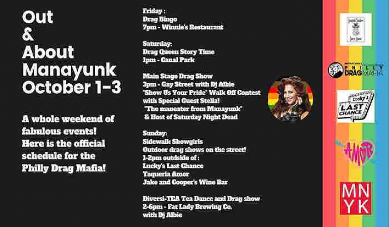 A full weekend of events brought to you by the Manayunk Guest Chambers, Manayunk.com and the Philly Drag Mafia!