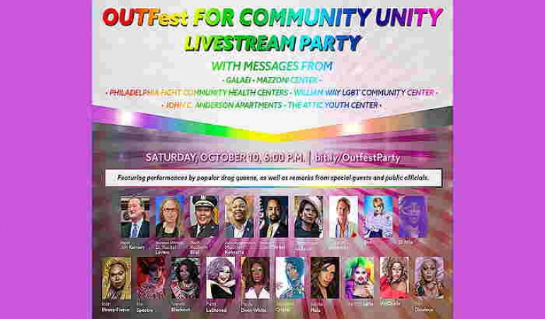 On Saturday, October 10th at 6:00 p.m., local organizations, individuals, and performers will celebrate Philadelphia’s LGBTQ community with a 90-minute virtual event called “OutFest for Community Unity.” The livestream will be available to view on YouTube and other outlets, and it will feature a mix of performances, messages from organizations, and individual shows of support for the LGBTQ community.