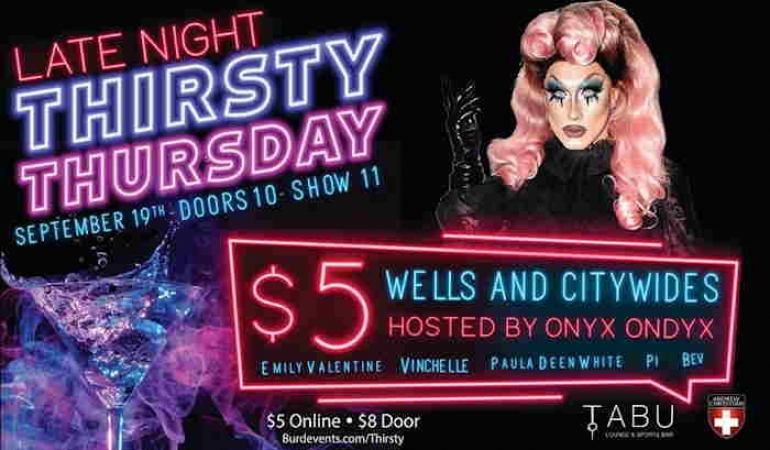 Join us at Tabu Lounge & Sports Bar on the 2nd floor for your Late Night Thirsty Thursday and Drag Show! $5 wells and citywides during the entire event with great giveaways from Andrew Christian, other Burd Events shows and drink tickets throughout the night!
