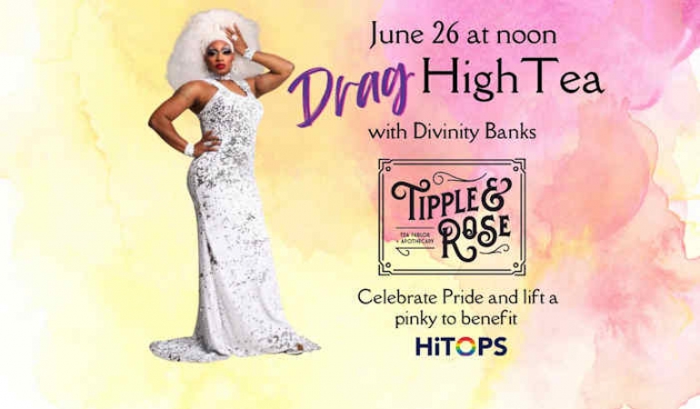 You are cordially invited to the Drag High Tea for HiTOPS at Tipple and Rose Tea Parlor and Apothecary in downtown Princeton on June 26 at noon. Sip (or spill) the tea in the company of our magnificent host, Divinity Banks.