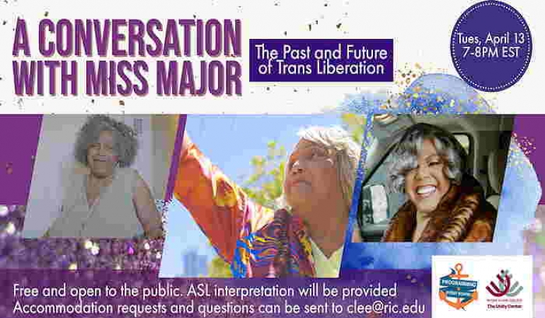 The Rhode Island College Programming Event Board and Unity Center invite you to a conversation with Miss Major Griffin-Gracy. Miss Major is a trans elder and direct participant in the 1969 Stonewall demonstrations that led to the founding of modern-day Pride celebrations. In this moment of unprecedented trans visibility and the continued struggle for trans liberation, we hope this discussion emphasizes how trans and queer commemorations must, like Miss Major’s activism, honor those most marginalized within the LGBTQ+ community.