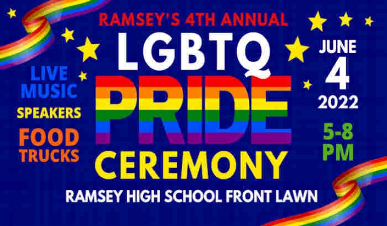 Local residents, guests, and allies are invited to Ramsey’s 4th annual LBGTQ Pride Ceremony. The event will take place on June 4th at 5:00 pm outside on the Ramsey High School front lawn located at 256 East Main Street. Highlights of the event include: