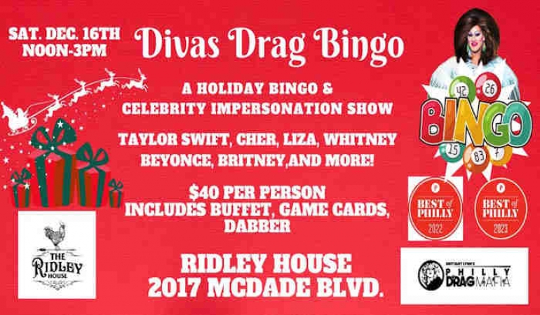 Join them for a fabulous evening of Drag Bingo at The Ridley House! Get ready to laugh, cheer, and win amazing prizes while our talented drag performers entertain you. Hosted by Brittany Lynn (Best of Philly 2022 and 2023 for BEST DRAG SHOWS AND DRAG BRUNCHES) and featuring her Philly Drag Mafia (Phillydragmafia.com)! Win prizes from local businesses!