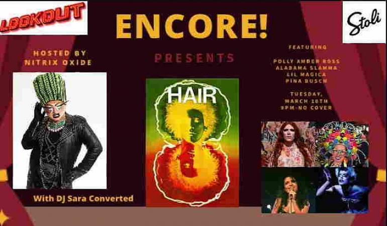 Encore is a drag show revue that celebrates the best of Broadway musicals. Every 2nd and 4th Tuesday, we pay tribute to a different musical and this time it's the 2009 Tony Award Winner for Best Revival of a Musical, Hair!
