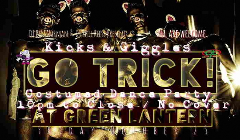 Kicks & Giggles. Dance for those who seek to find a way to leave their world behind. Join us this All Hallows weekend for Go Trick, an all-inclusive queer costume party. Feeling gruesome? Awesome. Feeling scandalous? Amazing!! Kicks & Giggles and the Green Lantern openly welcome those of all genders and body types to come out in celebration of YOU to SHAKE YOUR BOO-TY! Come as you are or rock a rad costume!! Maybe make a connection or two. The party kicks off at 10 with absolutely NO cover.