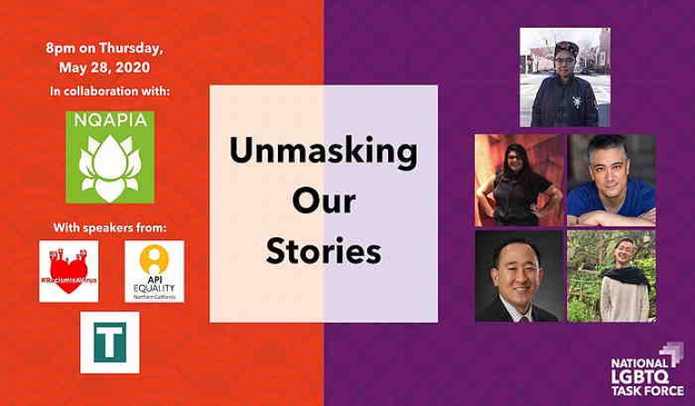 Join the National LGBTQ Task Force as we lift up National Queer Asian Pacific Islander Alliance (NQAPIA)’s new campaign: Unmasking Our Stories: LGBTQ+ Anti-Asian Violence Under COVID19 at a panel discussion on May 28th at 8pm EDT.